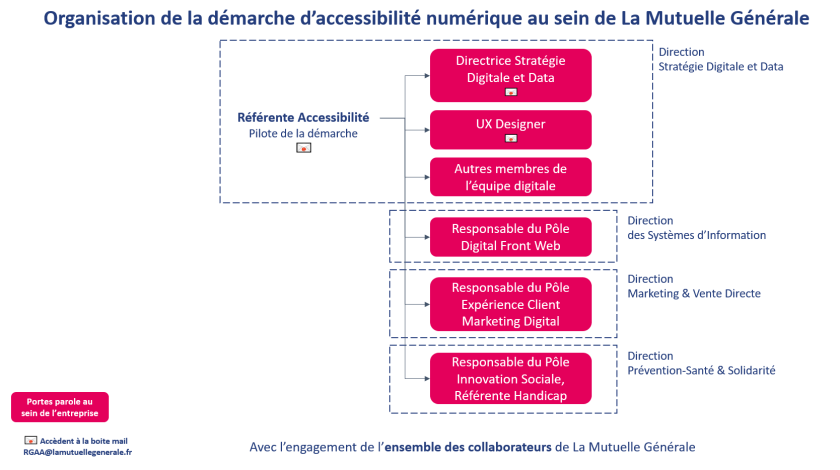 Au-delà de la référente accessibilité numérique de La Mutuelle Générale, qui pilote la démarche, plusieurs personnes sont identifiées au sein de l’entreprise pour prendre le relais de l’accessibilité numérique dans leurs services :